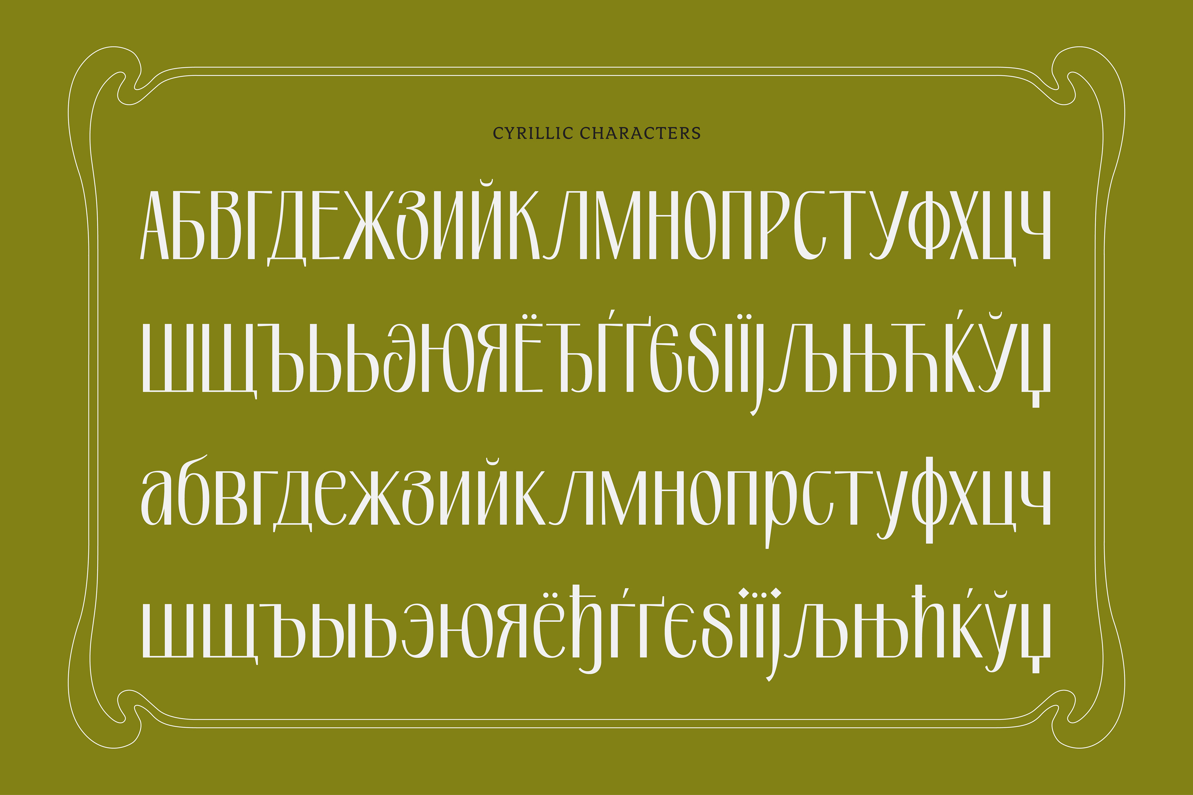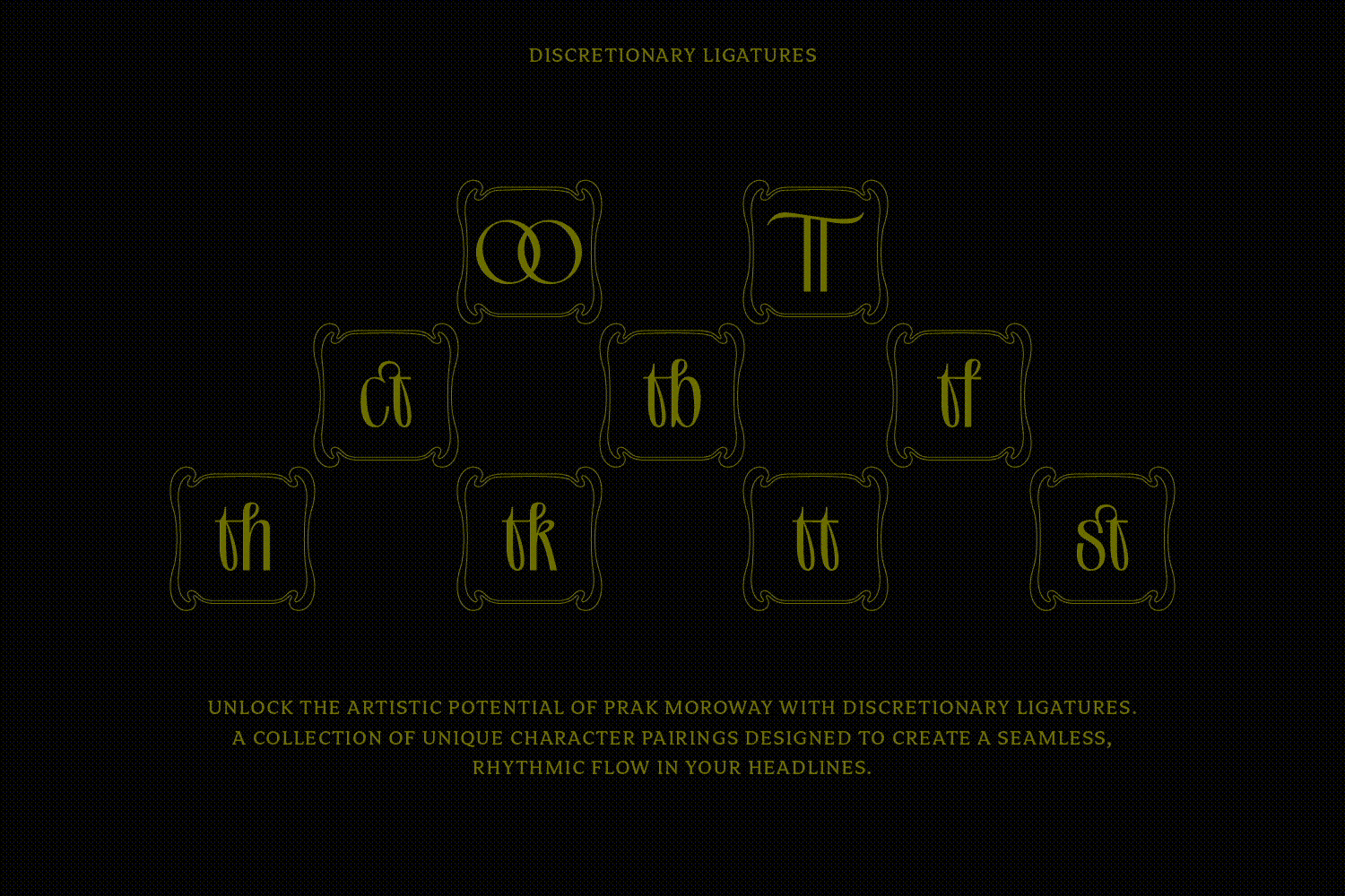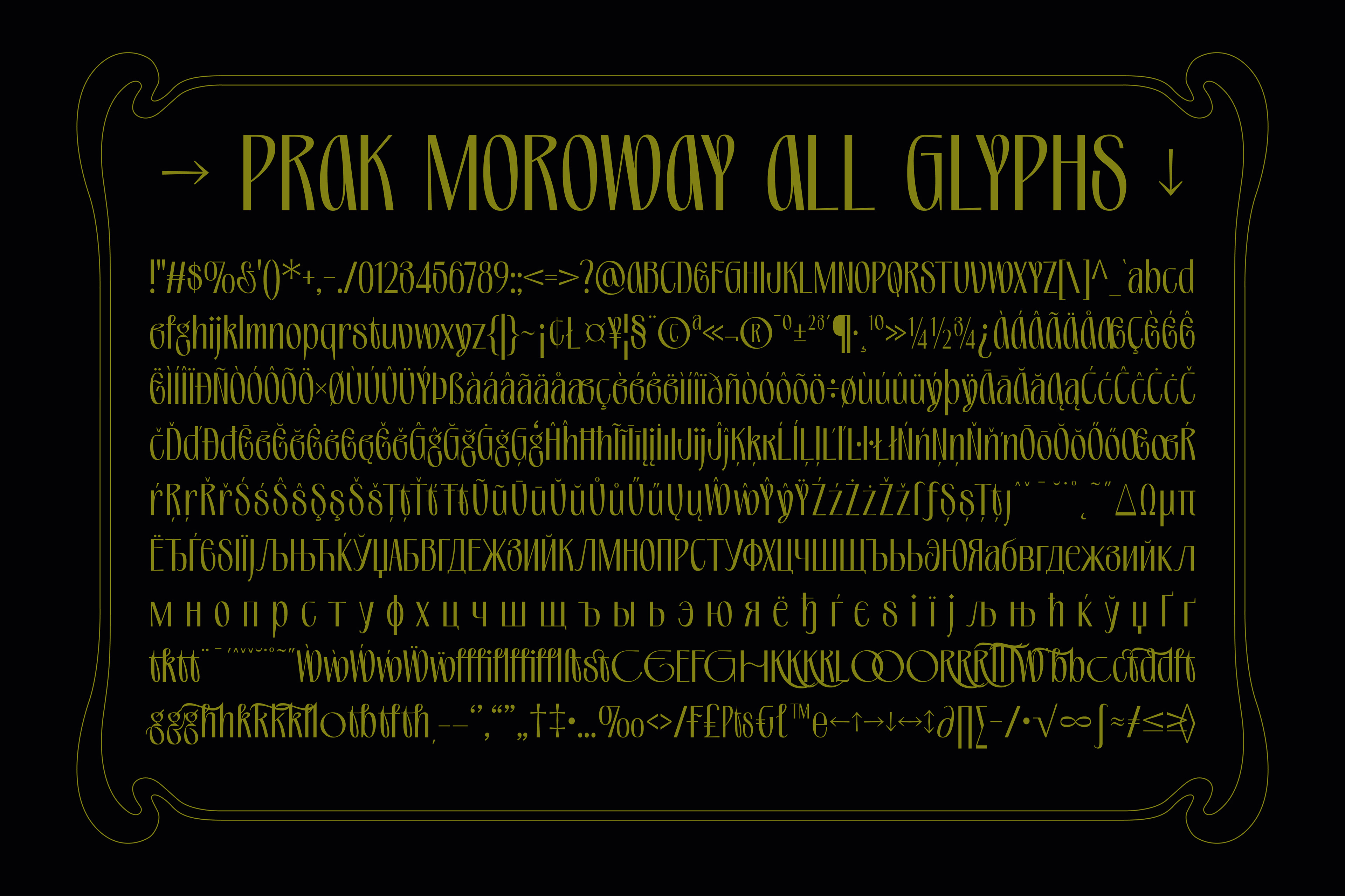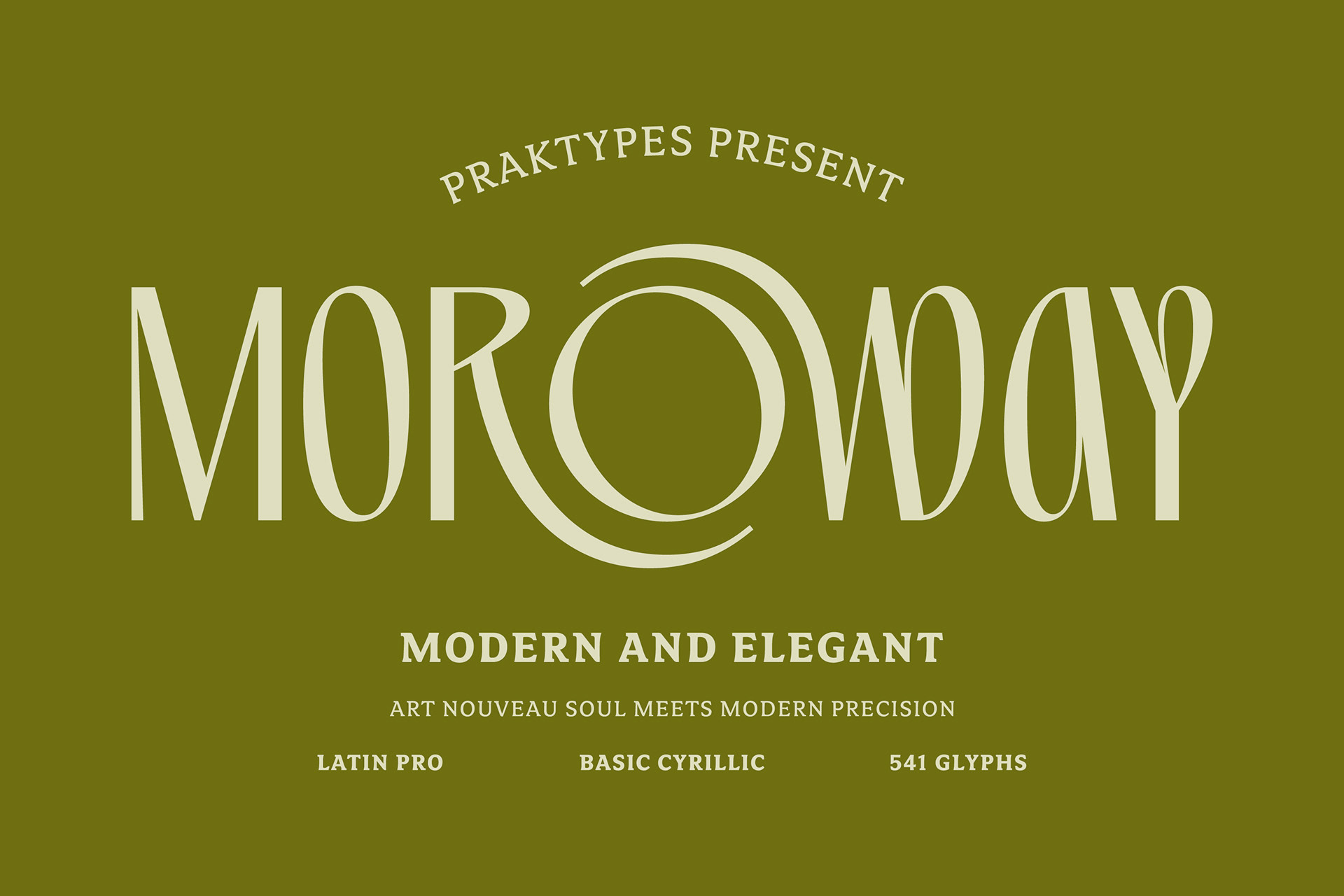 PRAK Moroway is a display font that blends the elegance of classic Art Nouveau lines with sleek modern proportions. The core of this typeface lies in the harmony between sharp thick-and-thin contrasts and naturally flowing organic curves. Designed to deliver an exclusive and characterful impression, PRAK Moroway is ideal for branding, book titles, artisanal product labels, and editorial designs that prioritize a strong visual aesthetic. Key Features: Organic Design: Elongated character silhouettes featuring fluid, graceful curves on specific letterforms. Extensive Language Support: Equipped with Latin Pro and Basic Cyrillic, enabling its use across various European and Slavic languages. Comprehensive Glyph Collection: Features a total of 541 glyphs, including uppercase, lowercase, numerals, punctuation, and a wide range of accented characters.